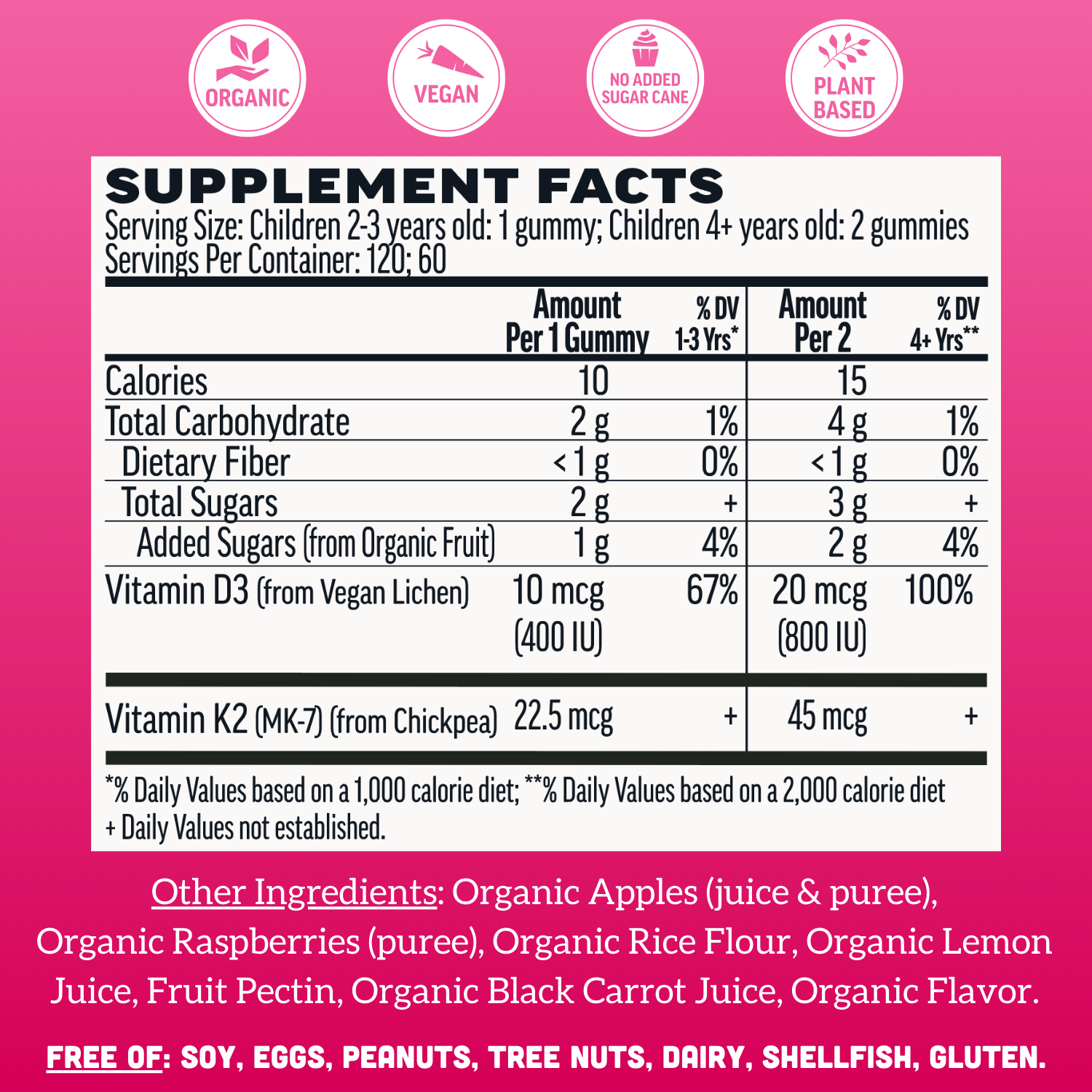 • Kids Vitamin D3 + K2 Gummies, Raspberry (120 ct)